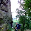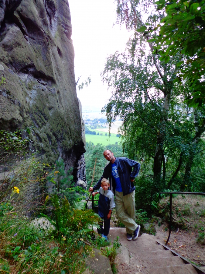 Zřícenina skalního hradu Drábské světničky:Tatínek rád řídí,maminka fotí, Pavlík to je velký kluk, Lukášek si cestou schrup!